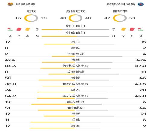 雷速體育10月2日宣 歐冠聯(lián)賽階段次輪,巴黎圣日耳曼客場以2-1逆轉(zhuǎn)巴塞羅那??v觀這場比賽,大巴黎在進(jìn)攻端的數(shù)據(jù)更勝一籌,最終拿到三分也在情理之中。 在這場比賽里,大巴黎在射門數(shù)上以15-12領(lǐng)先;在射正數(shù)上,大巴黎則更是以7-3遙遙領(lǐng)先,達(dá)到巴薩的2倍。這樣的數(shù)據(jù)足以說明,大巴黎占據(jù)著攻勢上的主動權(quán)。在控球率方面,大巴黎也以53%-47%占據(jù)著優(yōu)勢的地位。 在傳球方面,大巴黎以474-424同樣高出,傳球成功率方面則是以87.3%-86.6%稍占優(yōu)勢;在關(guān)鍵傳球方面,大巴黎則以13-8同樣優(yōu)勢明顯。在過人方面,巴薩以24-20領(lǐng)先,在過人成功率以54.2%-45%占優(yōu) 在防守端數(shù)據(jù)方面,雙方則各擅勝場,大巴黎在搶斷(21-17)占優(yōu);巴薩則在攔截(11-6)和解圍(17-9)這兩項(xiàng)數(shù)據(jù)上優(yōu)勢明顯。 技術(shù)統(tǒng)計(jì) |
