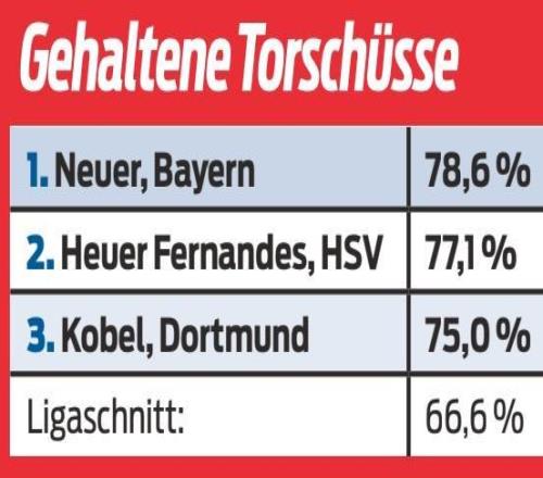 雷速體育10月8日宣 據(jù)德國(guó)《體育圖片》統(tǒng)計(jì),本賽季39歲的拜仁慕尼黑門(mén)將諾伊爾在德甲的撲救成功率為78.6%,是所有門(mén)將中最高的。 《體育圖片》統(tǒng)計(jì)了本賽季截止目前德甲球隊(duì)門(mén)將的撲救成功率,老將諾伊爾以78.6%的撲救成功率占據(jù)首位。排名第二的是升班馬漢堡的門(mén)將費(fèi)爾南德斯,其撲救成功率是77.1%。排名第三的是多特蒙德門(mén)將科貝爾,其撲救成功率為75%。 本賽季,諾伊爾代表拜仁在各項(xiàng)賽事出場(chǎng)15次,做出28次撲救,出擊19次,成功18次。他在德甲出場(chǎng)6次,全部首發(fā)并打滿90分鐘。 |