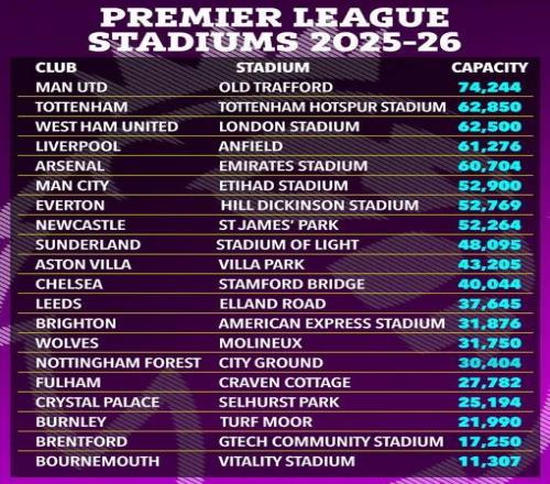 埃弗頓 變化:增加13355座位(2024-25賽季:39414 至 2025-26賽季:52769) 富勒姆 變化:增加3282座位(2024-25賽季:24500 至 2025-26賽季:27782) 阿斯頓維拉 變化:增加287座位(2024-25賽季:42918 至 2025-26賽季:43205) 曼聯(lián) 變化:增加47座位(2024-25賽季:74197 至 2025-26賽季:74244) 紐卡斯?fàn)柭?lián) 變化:增加6座位(2024-25賽季:52258 至 2025-26賽季:52264) 切爾西 變化:減少129座位(2024-25賽季:40173 至 2025-26賽季:40044)