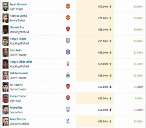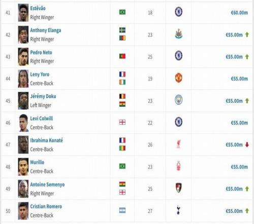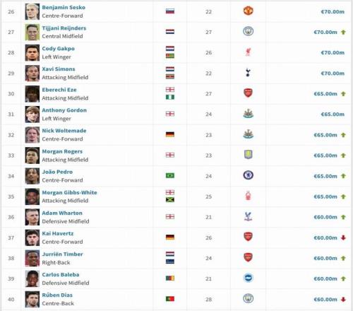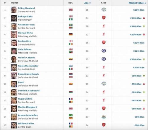 英超身價(jià)變更:維爾茨降至1.3億歐,薩卡降至1.4億歐,凱塞多升至1億歐