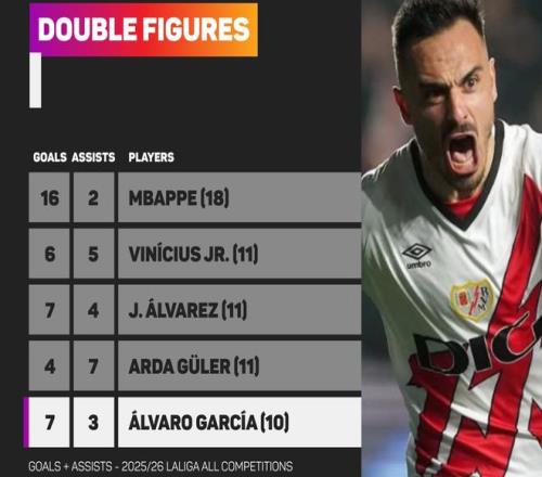 阿爾瓦羅加西亞是本賽季五大聯(lián)賽首位制造進(jìn)球上雙的西班牙球員