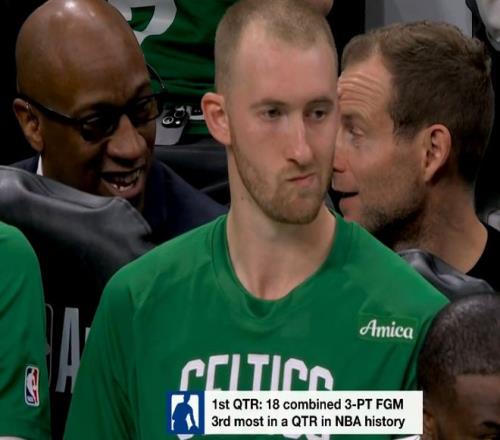 雷速體育10月30日訊 NBA常規(guī)賽繼續(xù)進(jìn)行,凱爾特人坐鎮(zhèn)主場與騎士交手。 首節(jié)比賽兩隊(duì)三分如雨,騎士三分12投10中,凱爾特人則是14投8中。 綠軍與騎士首節(jié)合計命中18記三分,排名NBA歷史單節(jié)三分命中數(shù)第3位。 |