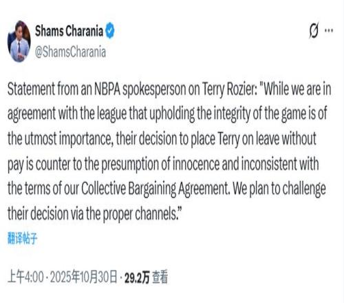 消息人士表示,羅齊爾本賽季約2660萬美元的薪水采用分期支付方式,目前這筆薪資將被存入托管賬戶。若羅齊爾(于10月24日被捕,數(shù)小時(shí)后被NBA要求停職)最終洗清嫌疑并獲準(zhǔn)重返NBA,他將全額獲得這筆被托管的薪資。 球員工會(huì)的一位發(fā)言人表示:“盡管我們與聯(lián)盟一致認(rèn)為維護(hù)比賽公正性至關(guān)重要,但他們讓特里停薪的決定,既違背了無罪推定原則,也與勞資協(xié)議的條款不符。我們計(jì)劃通過正當(dāng)渠道對這一決定提出異議?!?/p>