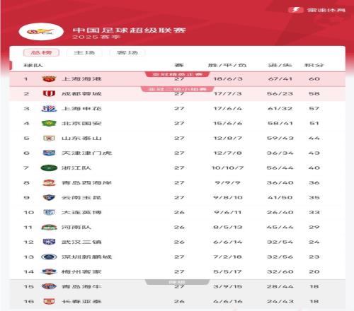 中超爭(zhēng)冠形勢(shì):前三齊出戰(zhàn)!海港最快今晚奪冠,蓉城申花命懸一線