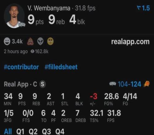 文班亞馬全場(chǎng)14投4中拿到9分9籃板2助攻4封蓋,出現(xiàn)6次失誤,令人大跌眼鏡。