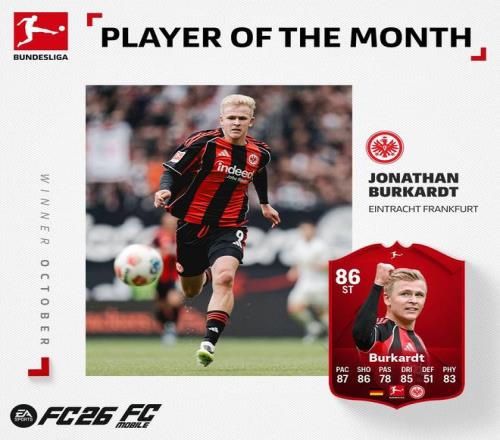 官方:法蘭克福前鋒伯卡特當(dāng)選德甲10月最佳球員