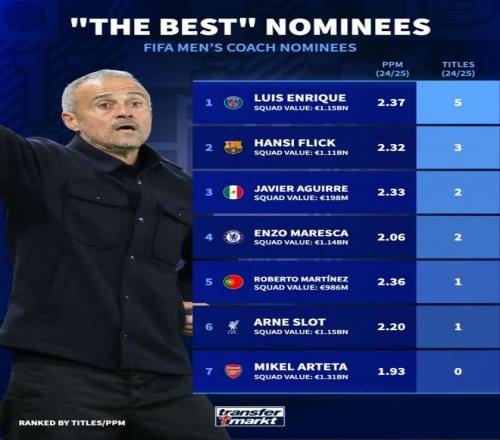 本賽季,姆伯莫為曼聯(lián)各項(xiàng)賽事出戰(zhàn)了11場(chǎng)比賽,打進(jìn)5球并送出1次助攻,他是球隊(duì)陣中狀態(tài)最出色的球員之一。 消息來(lái)源:Rahman Osman 2 - 阿爾特塔要加油了 FIFA公布年度最佳男足教練候選名單的,德國(guó)轉(zhuǎn)會(huì)市場(chǎng)列出了入圍者上賽季的成績(jī)。