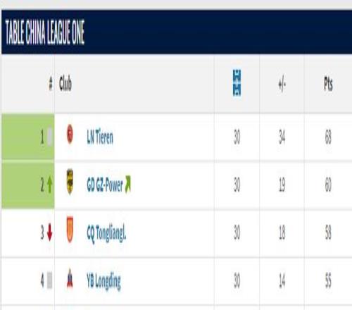 在即時積分榜上,廣州豹以60分排名第二位,而重慶銅梁龍以58分排名第三位。