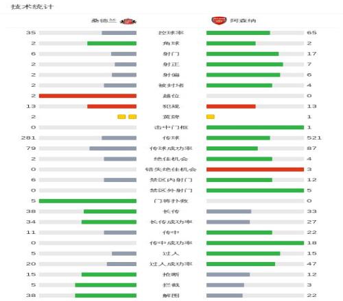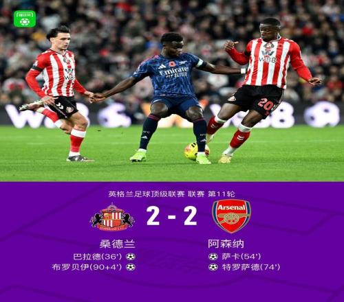 北京時(shí)間11月9日1:30,英超第11輪繼續(xù)進(jìn)行,阿森納作客光明球場(chǎng)挑戰(zhàn)桑德蘭,本場(chǎng)主裁判為克雷格-鮑森。上半場(chǎng),穆杰萊助攻巴拉德破門。下半場(chǎng),梅里諾助攻薩卡扳平比分,特羅薩德世界波助阿森納反超;補(bǔ)時(shí)階段,布羅貝伊高難度凌空破門絕平。最終,阿森納客場(chǎng)2-2戰(zhàn)平桑德蘭,各項(xiàng)賽事十連勝遭終結(jié)。 關(guān)鍵事件