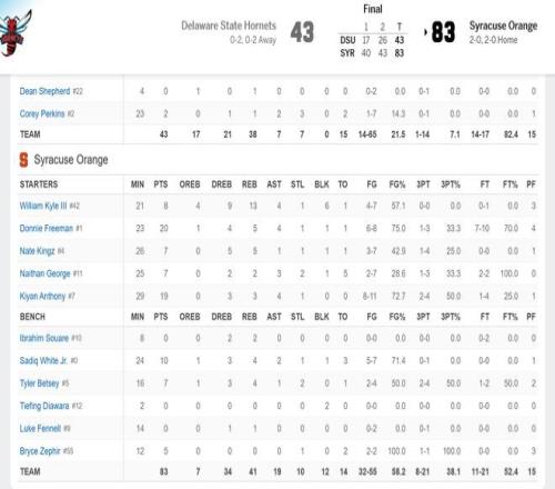 北京時(shí)間今日,在NCAA常規(guī)賽中,雪城大學(xué)以83-43擊敗了特拉華州立大學(xué)。