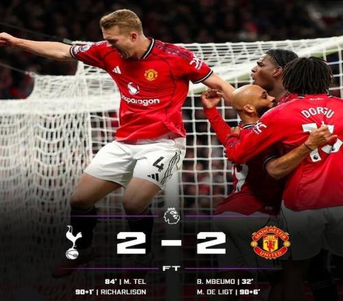 北京時間11月8日20點(diǎn)30分,25-26賽季英超第11輪迎來焦點(diǎn)較量,托特納姆熱刺坐鎮(zhèn)主場迎戰(zhàn)曼聯(lián)。 雙方成功上演2-2神劇情,熱刺7分鐘連進(jìn)2球補(bǔ)時逆轉(zhuǎn)比分,但曼聯(lián)拒絕被逆轉(zhuǎn),德里赫特壓哨讀秒破門!