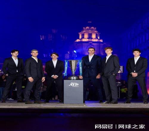 拍攝在都靈的夜間進(jìn)行,實(shí)際的拍攝效果非常出色,激光束、閃耀的藍(lán)光,以及置于照片中央的ATP總決賽獎(jiǎng)杯共同構(gòu)成了畫面。獎(jiǎng)杯象征著球員們一年以來努力爭取的榮耀——那是一座高大的銀色獎(jiǎng)杯,寬闊的杯耳、銳利的線條和ATP 的標(biāo)志一目了然。鏡頭里的所有布景都很完美,唯一的問題就是幾張關(guān)鍵面孔的明顯缺席。當(dāng)然,阿爾卡拉斯和辛納依舊以深色西裝和自信的笑容搶盡風(fēng)頭。