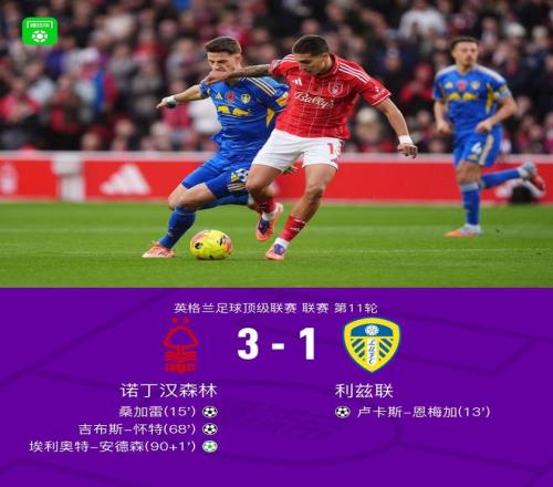 北京時(shí)間11月9日,英格蘭足球超級(jí)聯(lián)賽第11輪,諾丁漢森林坐鎮(zhèn)主場(chǎng)迎戰(zhàn)利茲聯(lián)。比賽開(kāi)局階段,利茲聯(lián)通過(guò)一次快速進(jìn)攻取得領(lǐng)先,阿倫森送出助攻,盧卡斯-恩梅加破門。僅兩分鐘后,諾丁漢森林迅速還以顏色,桑加雷將比分扳平。易邊再戰(zhàn),諾丁漢森林持續(xù)加強(qiáng)攻勢(shì),第68分鐘,奧馬里-哈欽森突破后送出關(guān)鍵傳球,吉布斯-懷特頭球破門幫助球隊(duì)反超比分。進(jìn)入補(bǔ)時(shí)階段,埃利奧特-安德森點(diǎn)球穩(wěn)穩(wěn)命中,鎖定勝局。最終,諾丁漢森林以3比1逆轉(zhuǎn)戰(zhàn)勝利茲聯(lián)。 關(guān)鍵事件 第13分鐘,先拔頭籌,恩梅加打遠(yuǎn)角破門,利茲聯(lián)1-0領(lǐng)先
