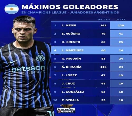 勞塔羅·馬丁內(nèi)斯(L. Martínez) 職業(yè)生涯在歐冠效力的俱樂部:國際米蘭 出場次數(shù):60 進(jìn)球次數(shù):24 場均進(jìn)球:0.40 伊瓜因(G. Higuaín) 職業(yè)生涯在歐冠效力的俱樂部:皇家馬德里、那不勒斯、尤文圖斯 出場次數(shù):83 進(jìn)球次數(shù):24 場均進(jìn)球:0.29