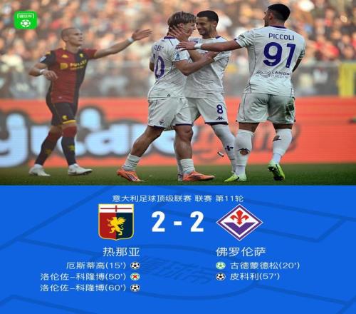 北京時(shí)間11月9日22:00,意甲第11輪展開角逐,熱那亞坐鎮(zhèn)主場(chǎng)迎戰(zhàn)佛羅倫薩。比賽開局階段,厄斯蒂高頭球破門,古德蒙德松主罰命中,將比分扳平;下半場(chǎng)伊始,科隆博主罰點(diǎn)球被德赫亞撲出,隨后皮科利幫助球隊(duì)反超比分,但德赫亞失誤送科隆博攻入一球。最終比分定格在2-2,最終雙方握手言和,各取一分。 關(guān)鍵事件 第15分鐘,厄斯蒂高前插頭球破門,熱那亞1-0領(lǐng)先