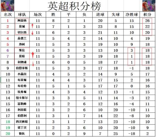 積分榜方面,阿森納26分依然是高居榜首,曼城大勝利物浦后再次開(kāi)啟連勝模式,超過(guò)切爾西2分重回前2,落后榜首的阿森納4分。慘敗的利物浦被大勝的維拉超過(guò),因?yàn)檩數(shù)奶?,還被曼聯(lián)躺著超過(guò),從第6繼續(xù)下跌,已經(jīng)是跌到第8了。