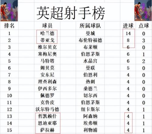 射手榜方面,哈蘭德今天雖然失點(diǎn),但最后也打入了一球,14球繼續(xù)穩(wěn)居榜首。蒂亞戈梅開(kāi)二度,超過(guò)塞梅尼奧2球獨(dú)居第2,落后榜首的哈蘭德6球。維爾貝克,塞梅尼奧,馬特塔6球并列第3。薩拉赫無(wú)力破門(mén),還是和理查利森,哲凱賴(lài)什等人4球剛好擠入前十。 |
