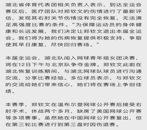 記者12日上午從第十五屆全國運動會湖北省體育代表團獲悉,巴黎奧運會網(wǎng)球女單金牌得主鄭欽文將缺席本屆賽事。 此前,鄭欽文報名參加十五運會網(wǎng)球女子單打、雙打比賽,開幕式上她作為湖北省體育代表團旗手亮相,希望在全運會賽場上為家鄉(xiāng)爭光。