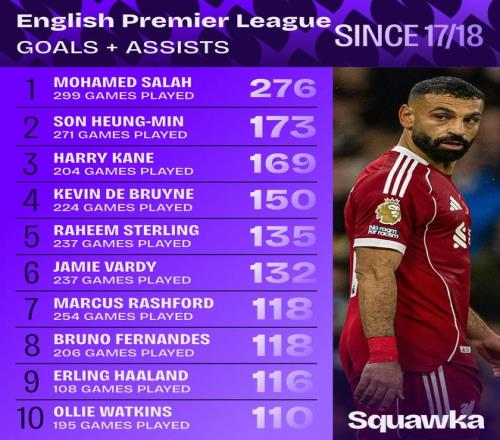 1、薩拉赫 299場(chǎng) 276球 2、孫興慜 271場(chǎng) 173球 3、哈里-凱恩 204場(chǎng) 169球 4、德布勞內(nèi) 224場(chǎng) 150球 5、斯特林 237場(chǎng) 135球 6、瓦爾迪 237場(chǎng) 132球 7、拉什福德 254場(chǎng) 118球 8、布魯諾-費(fèi)爾南德斯 206場(chǎng) 118球 9、哈蘭德 108場(chǎng) 116球 10、沃特金斯 195場(chǎng) 110球 【上咪咕獨(dú)家看英超】 |