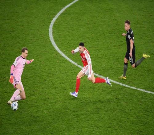 不過加布里埃爾缺席,終究讓兵工廠防線百密一疏。10分鐘后頂替加布里埃爾的莫斯克拉盯人不緊,被卡爾門前搶點(diǎn)扳平比分。這是阿森納本賽季歐冠首個(gè)失球,歐冠不失球紀(jì)錄止于391分鐘。這也是卡爾歐冠第2球,拜仁歐冠最年輕進(jìn)球紀(jì)錄也是他創(chuàng)造(17歲零242天)。 盡管6分鐘后特羅薩德因傷退賽,但阿森納下半場(chǎng)表現(xiàn)堪稱完美。阿爾特塔的換人立竿見影,第68分鐘卡拉菲奧里、馬丁內(nèi)利出場(chǎng),1分鐘后意大利右后衛(wèi)前插禁區(qū)下底傳中,助攻馬杜埃凱再次領(lǐng)先。第76分鐘諾伊爾沖出禁區(qū)攔截馬丁內(nèi)利的單刀球撲空,阿森納主場(chǎng)3比1終結(jié)拜仁賽季18場(chǎng)不敗,以近乎完美表現(xiàn)登頂歐冠。18天內(nèi),諾伊爾兩次致命失誤,先后斷送了拜仁賽季16場(chǎng)連勝和18場(chǎng)不敗兩大紀(jì)錄。而諾伊爾職業(yè)生涯歐冠10次失誤導(dǎo)致失球,高達(dá)4次是在阿森納客場(chǎng)。