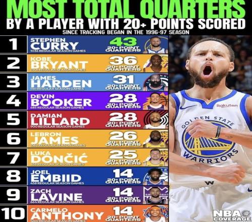 最近NBA Coverage發(fā)布了一份單節(jié)20分以上次數(shù)的排行榜,庫里、科比、詹姆斯、東契奇等得分手全部在列。 榜單之外,像杜蘭特、利納德這種火力同樣驚人的球星這次并沒有出現(xiàn),也難免讓人多看兩眼。 乍一看只是統(tǒng)計了誰一節(jié)爆發(fā)得最多,往下細看卻會發(fā)現(xiàn),一波流型的球員和整場穩(wěn)定磨血的球員完全是兩種路子。 到底該更看重單節(jié)的瞬間打瘋,還是整季場均的長期輸出?