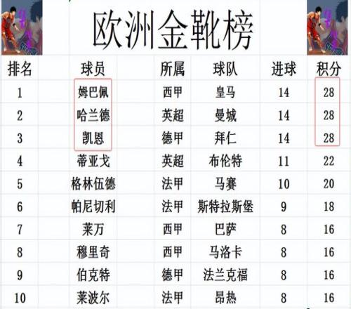 歐洲金靴榜最新戰(zhàn)報姆巴佩凱恩哈蘭德第1意甲無人進前十