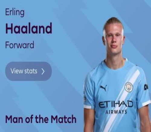 英超第14輪,曼城客場(chǎng)5-4險(xiǎn)勝富勒姆,此役打入一球達(dá)成英超百球里程碑的哈蘭德當(dāng)選英超官方全場(chǎng)最佳球員。