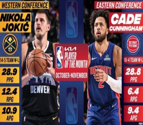 NBA官方公布了本賽季10-11月東西部月最佳球員,掘金球星約基奇和活塞球星康寧漢姆分別當(dāng)選。約基奇在這段時間里率領(lǐng)掘金取得了14勝5負(fù)的戰(zhàn)績,場均可以得到28.9分12.4籃板10.9助攻的大號三雙。康寧漢姆在這段時間里率領(lǐng)活塞取得了16勝4負(fù)的戰(zhàn)績,場均可以得到28.8分6.4籃板9.4助攻。 Shams:錫安遭遇右內(nèi)收肌拉傷三周后復(fù)查