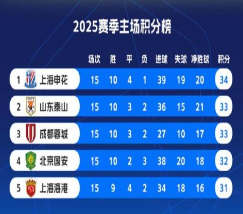 2025賽季中超主場成績排名:申花34分居首,海港31分排名第五
