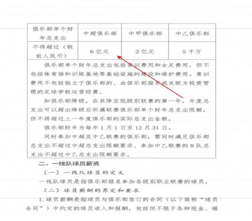 先來(lái)看一下大家比較關(guān)心的兩個(gè)點(diǎn):1,中足聯(lián)規(guī)定:中超俱樂(lè)部在“單個(gè)財(cái)年”的投資上限是6億元人民,中甲俱樂(lè)部上限是2億元人人民幣,乙級(jí)俱樂(lè)部的上限是5000萬(wàn)人民幣。
