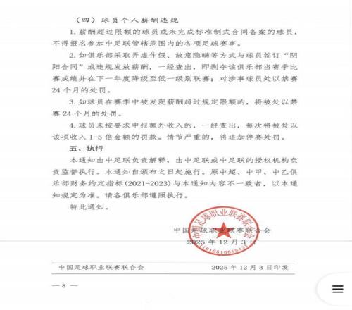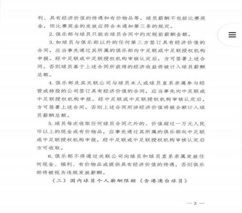 據(jù)足球報(bào)報(bào)道,12月3日下午,中足聯(lián)發(fā)布《中國(guó)足球職業(yè)聯(lián)賽俱樂部財(cái)務(wù)約定指標(biāo)》,對(duì)職業(yè)俱樂部一線隊(duì)球員薪資做出了詳細(xì)規(guī)定: 中超俱樂部國(guó)內(nèi)球員個(gè)人薪酬不得超過500萬元(稅前),中甲國(guó)內(nèi)球員個(gè)人薪酬不得超過300萬元(稅前),中乙國(guó)內(nèi)球員個(gè)人薪酬不得超過120萬。 中超俱樂部外援個(gè)人薪酬不得超過300萬歐元(稅前),中甲俱樂部外援個(gè)人薪酬不得超過150萬歐元(稅前)。 中超俱樂部外援薪酬總額不得超過1000萬歐元(稅前),中甲俱樂部外援薪酬總額不得超過400萬歐元(稅前)。中超俱樂部國(guó)內(nèi)球員平均薪酬限額不得超過500萬元(稅前),中甲國(guó)內(nèi)球員平均薪酬限額不得超過300萬元(稅前),中乙國(guó)內(nèi)球員平均薪酬限額不得超過50萬元(稅前)。 至于入籍球員,各俱樂部可自行選擇本俱樂部的入籍球員按照國(guó)內(nèi)球員或外籍球員標(biāo)準(zhǔn)執(zhí)行相應(yīng)的薪酬限額(包括球員個(gè)人薪酬限額、國(guó)內(nèi)球員平均薪酬限額或外籍球員薪酬總額),并在中足聯(lián)或中足聯(lián)授權(quán)機(jī)構(gòu)備案,如中超俱樂部選擇本俱樂部的入籍球員按外籍球員標(biāo)準(zhǔn)執(zhí)行薪酬限額,則外籍球員單個(gè)財(cái)年薪酬總額上限增加200萬歐元,同時(shí)除入籍球員外的外籍球員薪酬總額不得超過(稅前歐元)1.000萬:中甲俱樂部選擇本俱樂部的入籍球員按外籍球員標(biāo)準(zhǔn)執(zhí)行薪酬限額,則外籍球員單個(gè)財(cái)年薪酬總額上限增加80萬歐元,同時(shí)除入籍球員外的外籍球員薪酬總額不得超過(稅前歐元)400萬。 來源 九派新聞 北京日?qǐng)?bào) 足球報(bào) D21 |