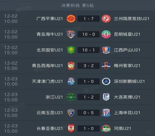 L組(9-16排位組) 青島海牛10-0昆明城星 這是一場(chǎng)一邊倒的比賽,姚子諾上演大四喜,劉千碩梅開(kāi)二度,張瑞琦、郭富鑫、郭文浩、談?wù)兹桓鬟M(jìn)一球。青島海牛10球大勝昆明城星。 北京國(guó)安10-1江西廬山 國(guó)安同樣進(jìn)了10個(gè)!王子皓上演帽子戲法,張昊冉梅開(kāi)二度,許科斯、蔣子承、劉科宏、王宇翔、任正旗各進(jìn)一球,江西由劉續(xù)澤打進(jìn)挽回顏面的一球。最終,國(guó)安10-1大勝江西廬山。 青島西海岸3-2梅州客家 第27、43分鐘,陳瑋欣、李汶聰各入一球,梅州客家2-0領(lǐng)先。易地再戰(zhàn),第53分鐘,欒昊破門(mén)扳回一球,西海岸1-2。第71、74分鐘,金凱、林明建破門(mén),西海岸完成大逆轉(zhuǎn)!最終,青島西海岸3-2戰(zhàn)勝梅州客家。 廣西平果1-7蘭州隴原競(jìng)技 廣西平果太差了!禹椋上演帽子戲法,徐奧冉、黃吉良、申由、胡焱博破門(mén)。毛略為廣西隊(duì)打進(jìn)挽回面的一球,最終蘭州隴原競(jìng)技7-1大勝?gòu)V西平果。