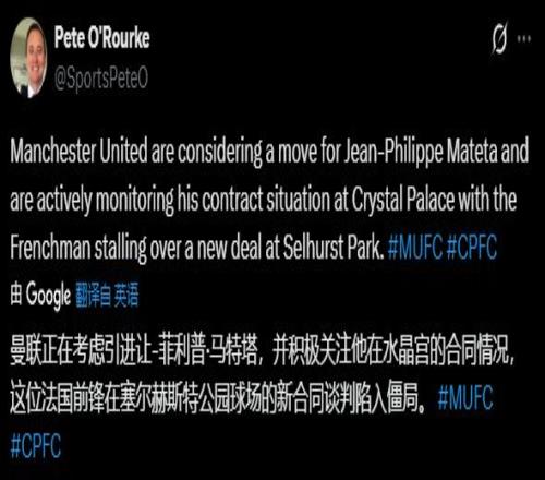 記者Pete O'Rourke透露:“曼聯(lián)正在考慮引進馬特塔,并積極關(guān)注他在水晶宮的合同情況,這位法國前鋒同水晶宮的新合同談判陷入僵局?!睂嶋H上,水晶宮正面臨著嚴重的人員流失風(fēng)險。過去一年,水晶宮的出色發(fā)揮令多名主力成為轉(zhuǎn)會市場香餑餑。夏窗埃澤已轉(zhuǎn)投阿森納;馬克·格伊合同臨近到期,夏窗差點加盟利物浦,預(yù)計下個夏窗自由離隊。