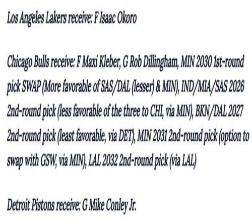 在這一交易方案中,仍處于新秀合同期的天才球員迪林厄姆將加盟芝加哥公牛隊(duì),公牛隊(duì)還將從森林狼隊(duì)獲得兩個(gè)次輪選秀權(quán)和一個(gè)2030年首輪選秀權(quán)互換權(quán)。 邁克·康利在這筆交易中不會(huì)加盟公牛隊(duì),而是被送往活塞隊(duì)——底特律將收獲一位在凱德·坎寧安身后保駕護(hù)航的老將控球后衛(wèi)。 這筆交易還涉及洛杉磯湖人,他們送走道爾頓·克內(nèi)希特、馬克西·克萊伯以及一個(gè)頗具價(jià)值的2032年次輪選秀權(quán),得到艾薩克·奧科羅。奧科羅是一個(gè)運(yùn)動(dòng)能力出色的側(cè)翼防守者,這正是湖人隊(duì)急需的球員類(lèi)型。自2023-24賽季以來(lái),他的三分球命中率達(dá)到38.1%,本賽季在芝加哥公牛隊(duì)的外線(xiàn)命中率也有37.8%。 以上的三筆交易方案均來(lái)自于權(quán)威美媒《clutchpoints》,以上截圖皆為該文的截圖。大家認(rèn)為哪些交易會(huì)達(dá)成呢? |