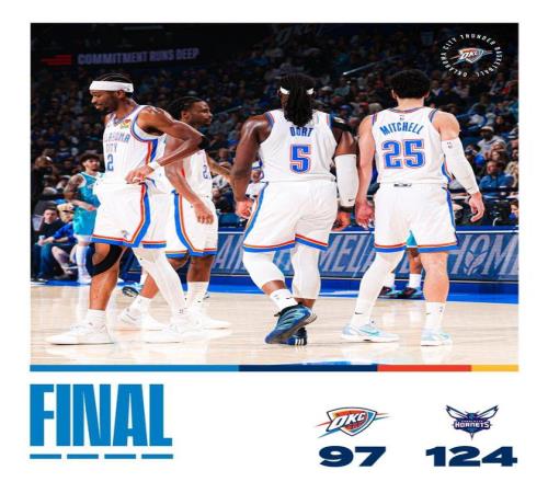 末節(jié)決戰(zhàn),迪亞巴特在禁區(qū)得手,黃蜂將分差擴(kuò)大至30分。雷霆遠(yuǎn)投手感依舊不理想,只能依靠著零星單打追分,分差始終在20分左右。OKC追分乏力,夏洛特則始終占據(jù)著場上主動權(quán)。距離終場還剩3分22秒,黃蜂領(lǐng)先27分鎖定大局。 兩隊此后在場上練兵,比賽就此失去了懸念。最終,黃蜂以124比97完勝雷霆。數(shù)據(jù)顯示:這是雷霆本賽季在主場的第二場失利,也是主場分差最大的失利,此前他們曾在主場以102-117不敵馬刺(圣誕大戰(zhàn))。 黃蜂爆冷完勝雷霆